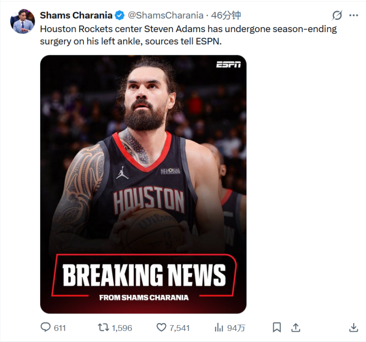 亚当斯的伤病源于1月18日火箭队击败鹈鹕队的比赛,当时他在防守锡安-威廉姆森的投篮时落地姿势不当,导致左脚踝受伤离场。赛后初步检查显示其脚踝出现严重扭伤,随后进一步诊断确认伤情为三级扭伤。根据名记Shams的报道,亚当斯已经接受了手术,提前赛季报销。